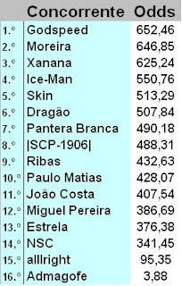 Os nossos concorrentes estão definitivamente a atravessar uma má fase, os resultados da Liga Bwin também não ajudam, mas esta semana voltámos a ter apenas 2 concorrentes com direito ao bónus mínimo de 25 pontos, por acertarem em 3 dos 5 palpites propostos... Todos os outros não conseguiram mais que 2 palpites certeiros!
